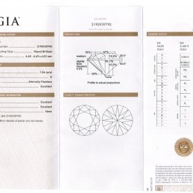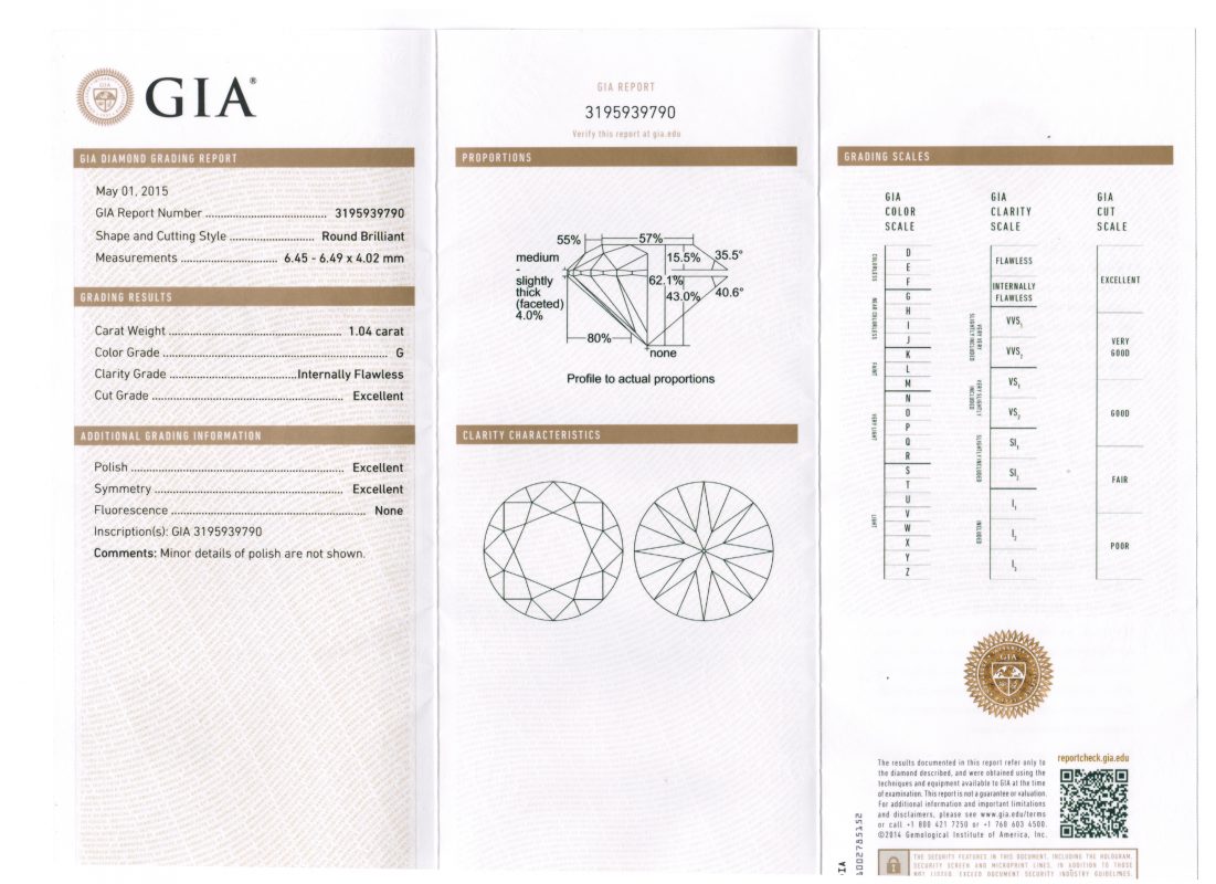 Colourgrade : G, Internally Flawless, keine Flourescence. Cut Grade = Excellent, Polish = Excellent, Symmetry = Excellent.